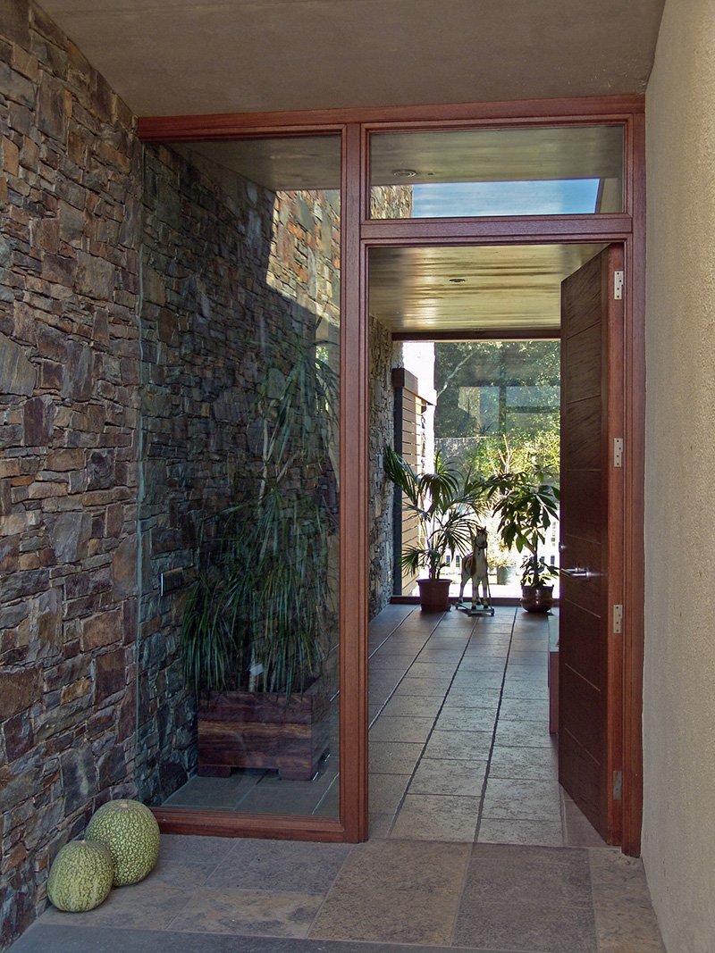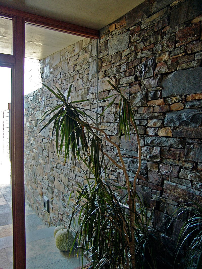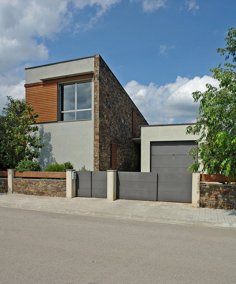 Un dels elements més significatius del projecte és el mur de pedra, que aporta una forta presència i connecta la casa amb la tradició constructiva local. La materialitat rústica de la pedra contrasta deliberadament amb la geometria neta i abstracta dels volums moderns, generant una tensió equilibrada entre passat i present. Aquest joc de contraposicions dona identitat a la casa i reforça la seva integració dins el paisatge de Sant Esteve de Palautordera.